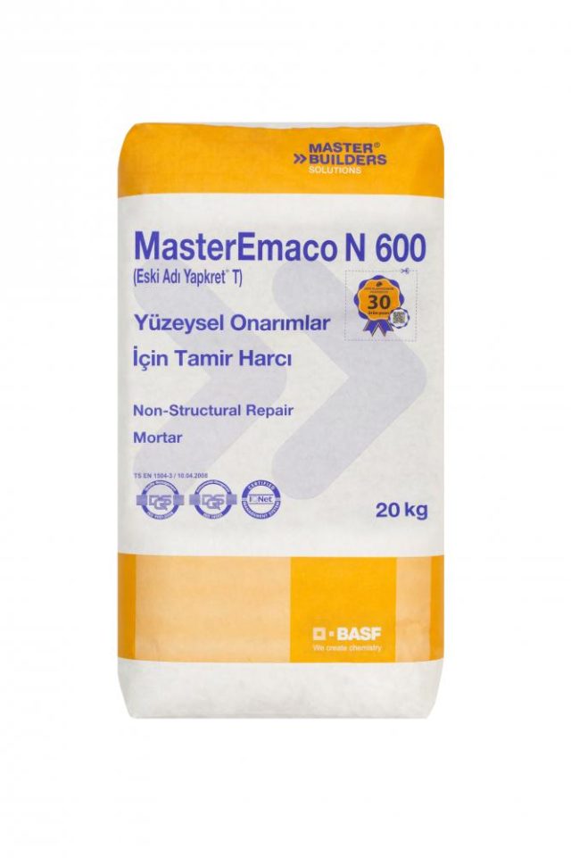 MasterEmaco N 600, çimento esaslı, tek bileşenli, polimer takviyeli, yüksek stabiliteye sahip brüt beton tamir harcıdır.
