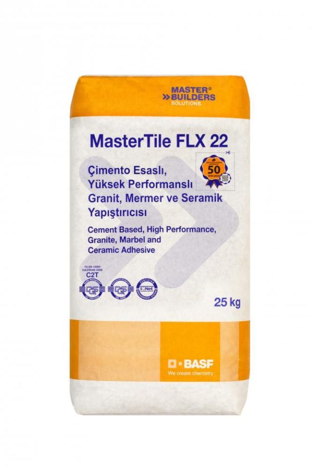 MasterTile FLX 22, çimento esaslı, granit, mermer, porselen seramik, doğaltaş ve seramik yapıştırılmasında kullanılan, soğuk sıcak döngüsünde yüksek stabilite ve performansa sahip yapıştırıcı.