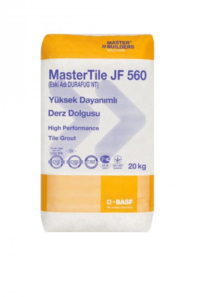 MasterTile JF 560, çimento esaslı, seramik, mermer, granit, antiasit seramik ve doğaltaş gibi kaplamaların derzleri için kullanılan, mekanik dayanımları yüksek, çeşitli kimyasallara ve bakterilere dayanıklı, kolay uygulanan, akışkan derz dolgu malzemesi.